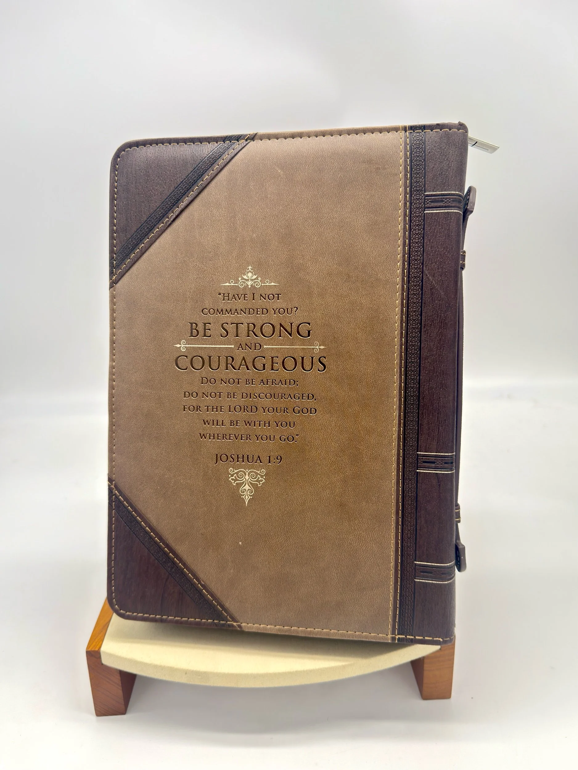Men's Collection › Be Strong And Courageous Bible Cover Image 1 of 2 Image 2 of 2 Be Strong And Courageous Bible Cover $28.00 • 7 3.4” x 10 3.4”• Zip Around Closure w/ Top Handle• Interior Pen Holder Add To Cart Added! • 7 3.4” x 10 3.4”• Zip Around Closure w/ Top Handle• Interior Pen Holder